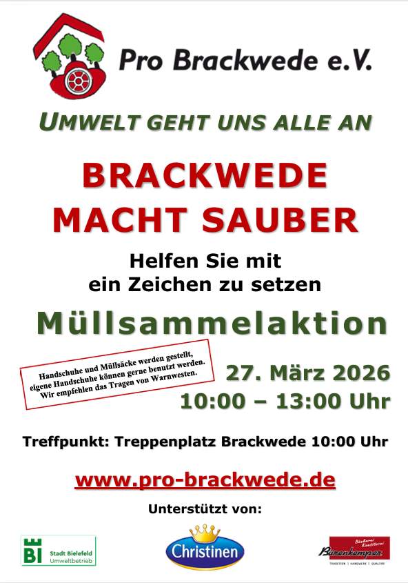 Um den 27.03.26 werden in diesem Jahr über 1000 Teilnehmende Brackwede großflächig von wildem Müll befreien. Die Realschule Brackwede, die Gesamtschule Rosenhöhe, das Brackweder Gymnasium, die Gesamtschule Quelle, die Vogelruthschule, die Schule am Möllerstift, die Brocker Schule, die Montessori Grundschule, eine Gruppe Geo Cacher und erstmalig auch die Lönkertschule werden kurz vor den Osterferien ein Zeichen für die Umwelt setzen. Die Aktion wird von Pro Brackwede e. V. mit Unterstützung des Umweltbetriebes, der Bäckerei Bürenkemper und Christinen Brunnen organisiert.